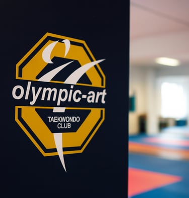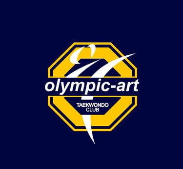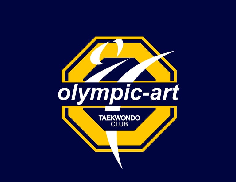 Please redesign our logo while keeping its octagon shape, blue/yellow colors, and the original "olympic art" lettering (especially the unique "L"). Include the words "Taekwondo", "Club", and "Olympic-Art", plus a taekwondo kicking character. Keep the identity, but modernize it.